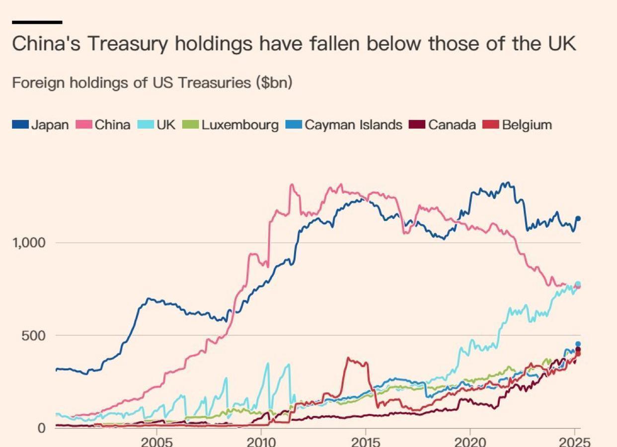 穆迪降级还没缓过神,英国给美债市场又添了一把火。2025年3月,英国增持了近300亿美元美债,总持仓达到7790亿美元,一举超越中国,成为美债的第二大持有国,仅次于日本。