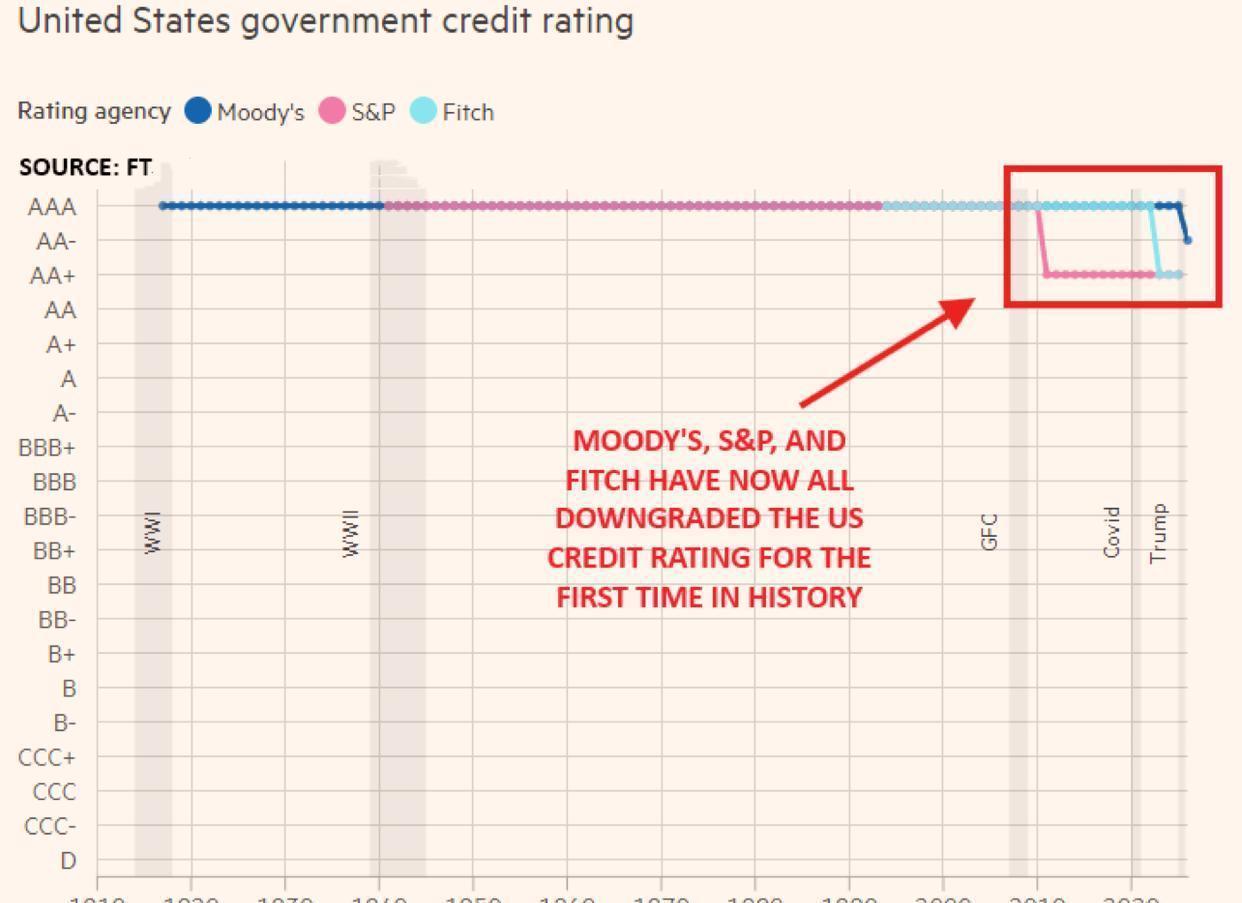 更让人不安的是,这已经是第三次被降级了。2023年8月惠誉、2011年8月标普,美国失去了最后的“AAA”光环。