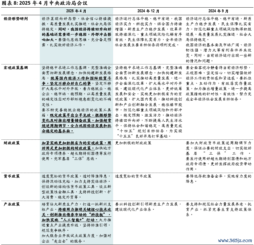 4月25日,中共中央政治局召开会议,分析研究当前经济形势和经济工作。本次政治局会议在肯定经济呈现向好态势的同时,直面“外部冲击影响加大”挑战,提出了一系列更具前瞻性和针对性的政策预案。会议明确要求“统筹国内经济工作和国际经贸斗争”,并提出“稳企业”要求,反映了对当前关税摩擦升级可能带来潜在冲击的高度重视。在政策工具箱方面,会议强调“加紧实施更加积极有为的宏观政策”的基调,提出适时降准降息、创设新的结构性货币政策工具,并加快地方政府专项债券、超长期特别国债发行使用,根据形势变化及时推出增量储备政策,体现出政策的灵活性与协同性。特别是在扩大消费、促进民生等关键领域。本次政治局会议提出一系列稳预期、提信心的具体举措,为应对外部不确定性、保持经济稳定运行和推进结构转型提供坚实保障。