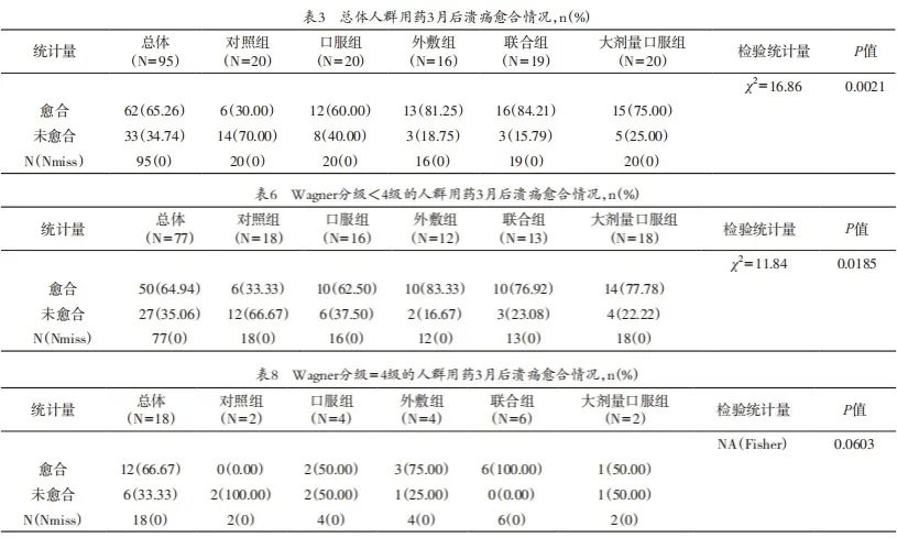 研究结果显示,总体人群不同分组在3月后的愈合率存在显著差异(p=0.0021)。常规治疗对照组的愈合率最低为30%。外敷组、联合组、大剂量口服组的愈合率分别为81.25%、84.21%、75.00%,均高于对照组,与对照组差异显著(p<0.05)。具体来看,Wagner分级<4级的人群不同分组在3月后的愈合率存在显著差异(p=0.0185)。对照组的愈合率为33.33%。外敷组、联合组、大剂量口服组的愈合率分别为83.33%、76.92%、77.78%,均高于对照组,与对照组差异显著(p<0.05)。Wagner分级4级的人群不同分组在3月后的愈合率存在显著差异(p=0.0603)。对照组无病例愈合。口服组、外敷组、大剂量口服组的愈合率分别为50.00%、75.00%、50.00%,虽高于对照组,但受病例数影响与对照组差异不显著(p>0.05)。但口服+外敷联合组的愈合率为100%,与对照组差异显著(p=0.0357)。