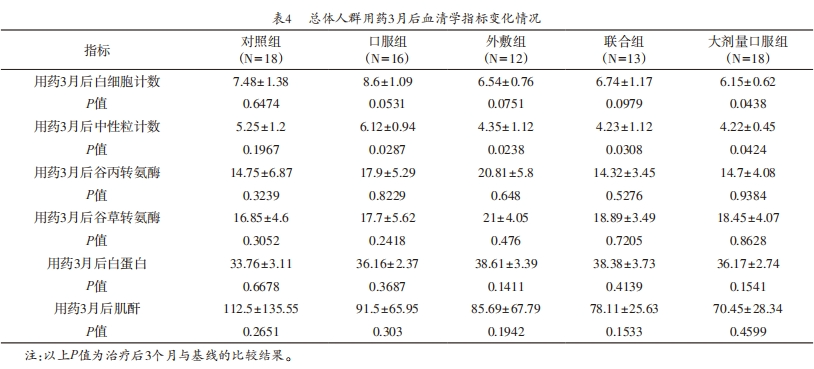 此外,治疗3个月后,大剂量口服组的白细胞水平显著下降(p=0.0438),其他组别未发现显著差异(p>0.05),各组数据均在正常参考范围内。中性粒细胞计数方面,除对照组外,其余干预组较治疗前均显著下降(p<0.05),亦未超出正常范围,提示可能具有一定的抗炎作用。同时,对于谷丙转氨酶、谷草转氨酶、白蛋白及肌酐的水平,治疗前后未观察到显著变化(p>0.05),说明药物安全性良好。