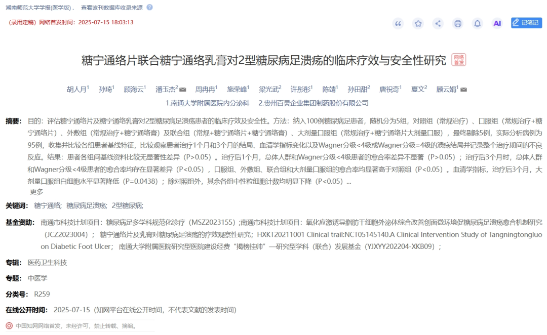7月15日,由贵州百灵(002424)企业集团申办、南通大学附属医院顾云娟教授担任主要研究者的“糖宁通络片联合糖宁通络乳膏对2型糖尿病足溃疡的临床疗效与安全性研究”成果论文,在中国科技核心期刊《湖南师范大学学报(医学版)》正式发表。